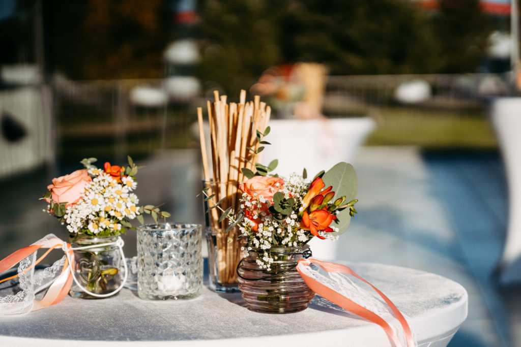 – Vasen weiß mit Henkel und Bänder: 8 Stück (siehe Titelbild + Bild Freie Trauung)